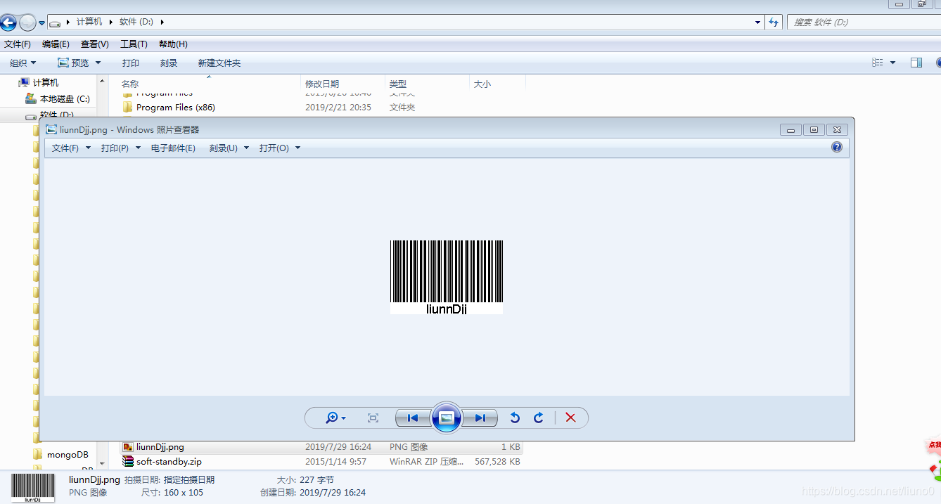 import java.awt.image.BufferedImage;import java.io.File;import java.io.FileNotFoundException;import java.io.FileOutputStream;import java.io.IOException;import java.io.OutputStream;import org.apache.commons.lang.StringUtils;import org.krysalis.barcode4j.impl.code39.Code39Bean;import org.krysalis.barcode4j.output.bitmap.BitmapCanvasProvider;import org.krysalis.barcode4j.tools.UnitConv; /** * 条形码工具类 * * @author liunn * @createDate 2019年07月29日 * */public class BarcodeUtil { /** * 根据信息生成图片文件 * * @param msg * @param path * @return File */ public static File generateFile(String msg, String path) { File file = new File(path); try { generate(msg, new FileOutputStream(file)); } catch (FileNotFoundException e) { throw new RuntimeException(e); } return file; } /** * 生成流输出到指定目录 * * @param msg * @param ous */ public static void generate(String msg, OutputStream ous) { if (StringUtils.isEmpty(msg) || ous == null) { return; } Code39Bean bean = new Code39Bean(); // 精细度 final int dpi = 150; // module宽度 final double moduleWidth = UnitConv.in2mm(1.0f / dpi); // 配置对象 bean.setModuleWidth(moduleWidth); bean.setWideFactor(3); bean.doQuietZone(false); String format = "image/png"; try { // 输出到流 BitmapCanvasProvider canvas = new BitmapCanvasProvider(ous, format, dpi, BufferedImage.TYPE_BYTE_BINARY, false, 0); // 生成条形码 bean.generateBarcode(canvas, msg); // 结束绘制 canvas.finish(); } catch (IOException e) { throw new RuntimeException(e); } } public static void main(String[] args) { //条形码信息 String msg = "liunnDjj"; //图片文件保存路径 String path = "D:/liunnDjj.png"; generateFile(msg, path); }} 运行main方法后会在D盘生成liunnDjj.png文件